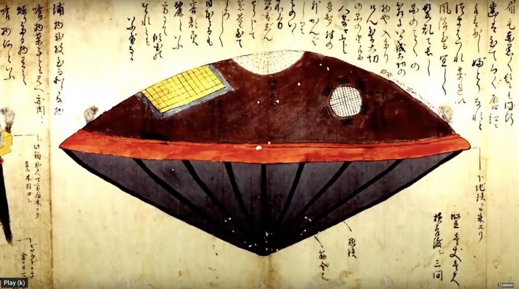 1803年,在日本日立省的东海岸,一艘奇怪的圆形USO被渔民拖上岸。三篇类似的文字描述了圆形“Utsuro Bune”(空心船)和一名在船内被发现的女性乘客。