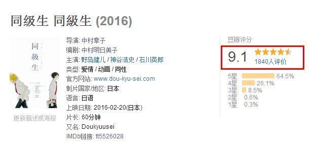 《同级生》是改编于日本漫画家中村明日美子创作的同名漫画,2016年就在日本上映,当时无论在电影圈、动漫圈都引起了一阵轰动,就连到了中国后,豆瓣评分迅速飙升到9.1