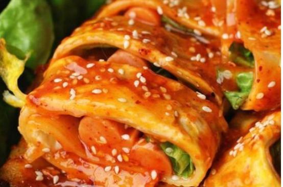 再涂上一层冷面酱,撒上葱花和火腿丁,放上一点生菜卷起来。吃起来也是非常香脆可口的。烹饪这款美食的工具也是很简单的,冷面也不用自己做了以直接购买,只要准备好一些客人们喜欢的配菜就非常完美了,想要摆地摊的朋友是非常值得一试的。