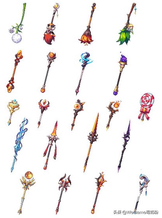 更有特点是魔法师武器,比较抢眼的有三把,棒棒糖武器,天蓝色的“矛”,绿色的扫把。