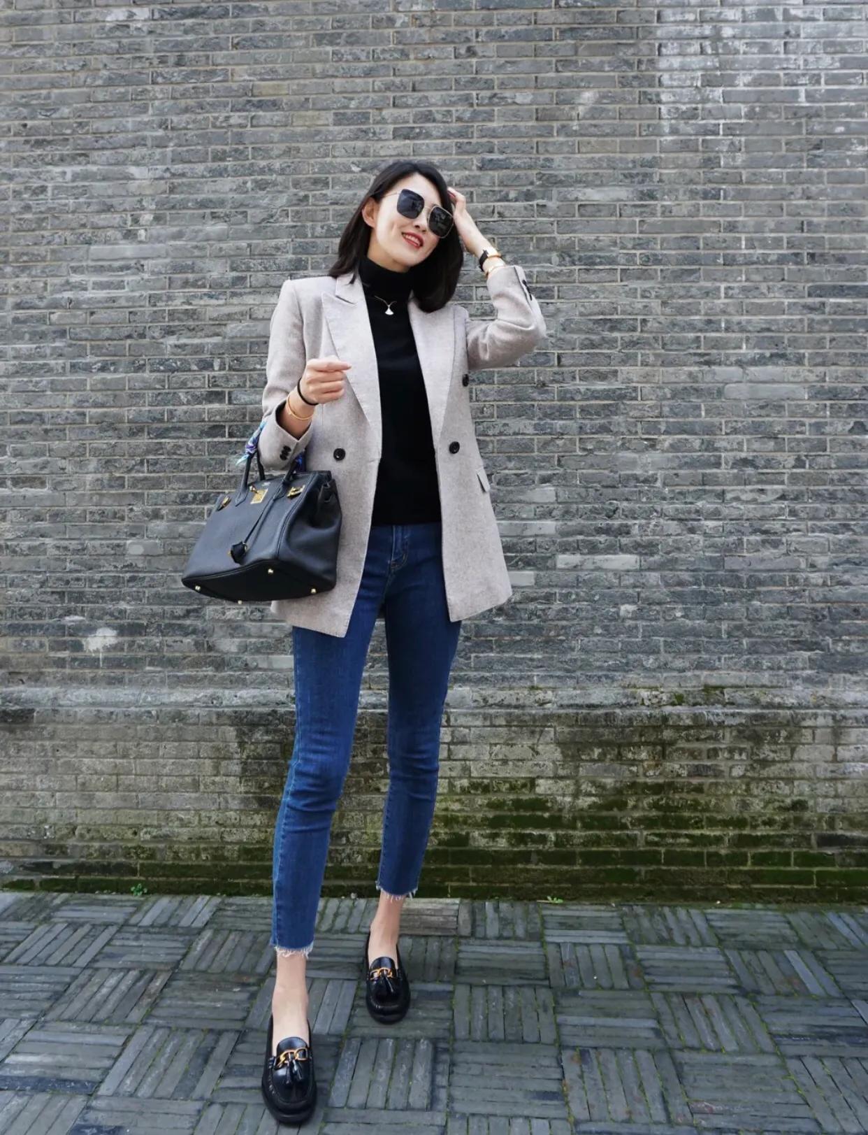 乐福鞋与紧身小脚牛仔裤的组合,对腿型和身材的要求就比较高啦,又瘦腿又细的姐妹们冲啊!