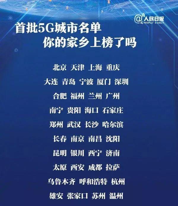 据悉,共有50个城市入选5G首批开通城市名单,即北京、上海、广州、深圳、杭州、南京、天津、武汉、济南、郑州、苏州、青岛、重庆、成都、宁波、温州、嘉兴、绍兴、东莞、佛山、中山、珠海、无锡、常州、南通、沈阳、长沙、大连、兰州、福州、石家庄、太原、西宁、西安、厦门、贵阳、雄安、呼和浩特、南宁、海口、哈尔滨、南昌、合肥、银川、昆明、长春、泉州、柳州、鹰潭、乌鲁木齐。