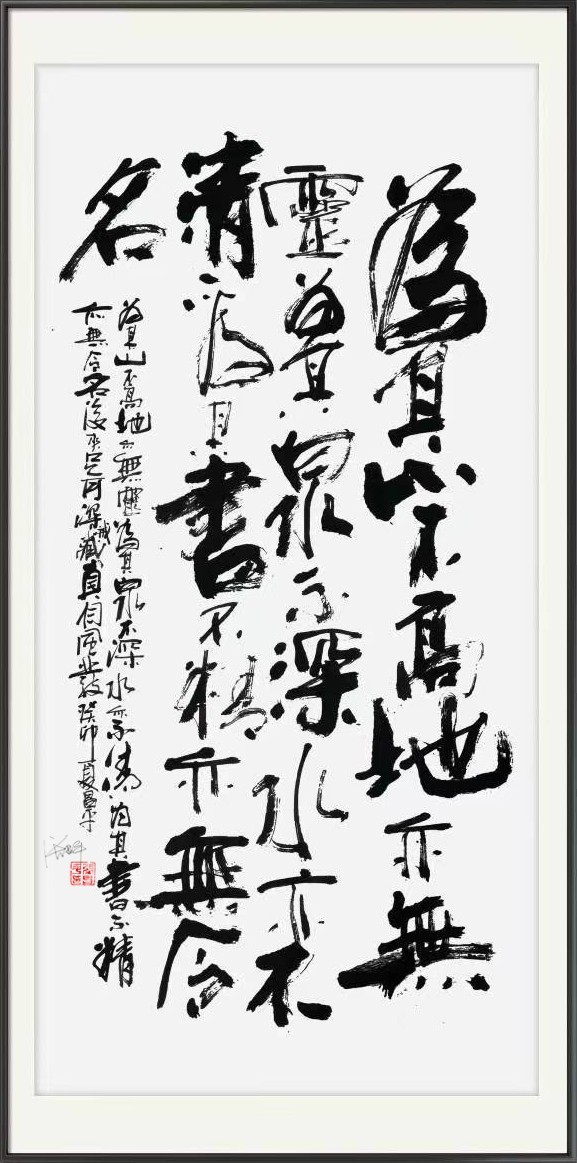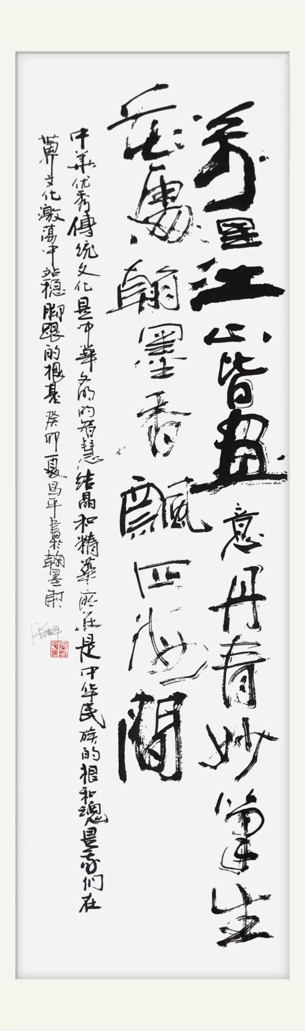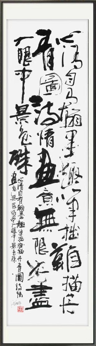 从用墨的角度来看,张昌平先生把当代书坛不注意墨韵体验的书法流弊进行了修复。不管别人如何,他对自己书法的墨感塑造相当用心,也显示了不同寻常的神韵表现。在他的书法作品中,无论行书还是草书,对墨的气脉追求都是非常明显的。以焦浓为根本,是笔法劲健的主体配合,焦显雄劲,黑显明纯,厚重沉着,尽在墨焦。如果不精益于墨法,一般不会有这种施大墨而显卓劲苍茫的意象,通常多有用墨成呆的失败。浓墨宰相是刘庸,焦墨方家张昌平,他的书法用墨既有文人手法的动逸,也有壮士抒怀的大度,焦浓映飞白,雄逸双全!