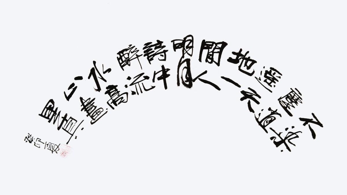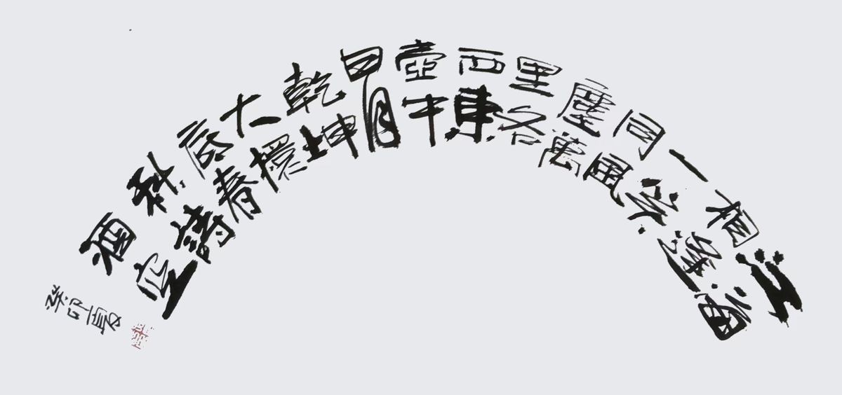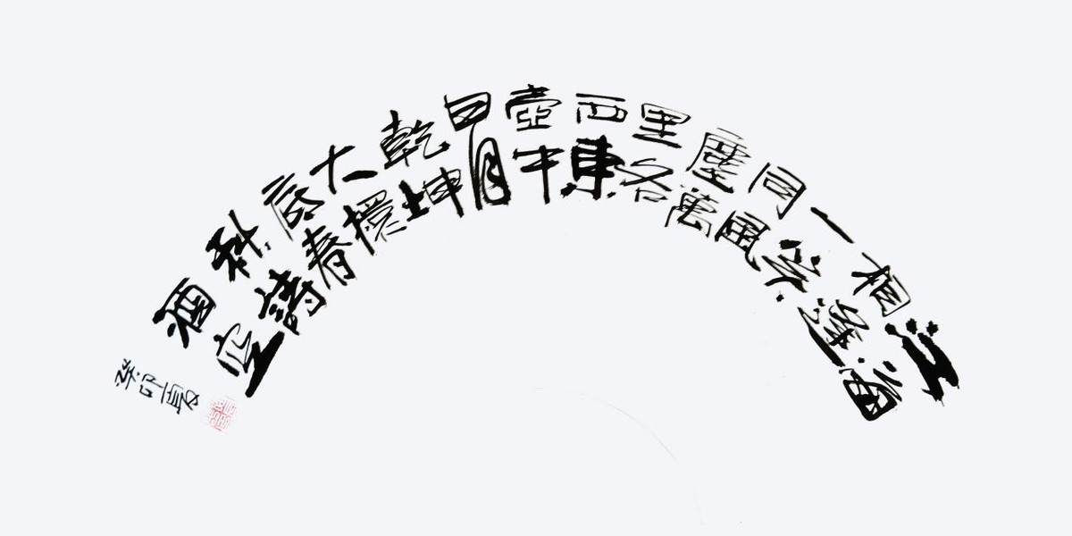 书法到达中锋行笔不偏不倚的境界之后,书法线条的劲感、动感、空间感在他的操纵下,就显的驾熟就轻,毫无惧笔怕墨的拘束结节,挥纵自如,收结潇洒。执笔侧入中行。笔锋的转承恰如楫击流水,波动凌微,然后或顺风而畅,或逆向聚劲,在笔法的快与慢,长与短,粗与细的变化中,依合自然的生命节奏,酝酿线条的生命质感:流动中的力量抒发,是他书法富有生命动感的独特风范,有劲,有力,富有变化,让他的书法在当代书坛体现着食古而化,功在传承与创新的导向路径。