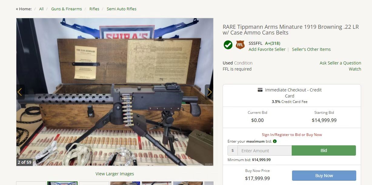 这东西价格并不便宜,在2016年,岩岛拍卖行的一次拍卖中,这款迷你M1919最终成交价格是5750美刀。这个价格作为拍卖来讲,还算可以。而三年后,仍然是岩岛拍卖行,同款枪型拍卖到了18400美刀。随着这玩意儿越来越少,成交价越来越高,去年有一挺最终是以20000美刀价格成交的。而且这几年这玩意儿起拍价格也是越来越高,最近正在拍卖的一挺M1919的起拍价是15000美刀,现在价格已经抬升到了17999美刀了。