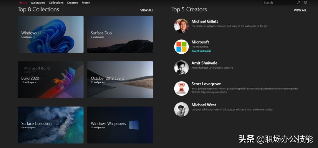 一个专门为微软做壁纸的网站,里面有超级多的精彩图片,可以找到微软各种软件自带的壁纸。你可以逛逛它的Top8精选系列,里面的壁纸质量都很高,而且还能一键下载整个系列的壁纸。