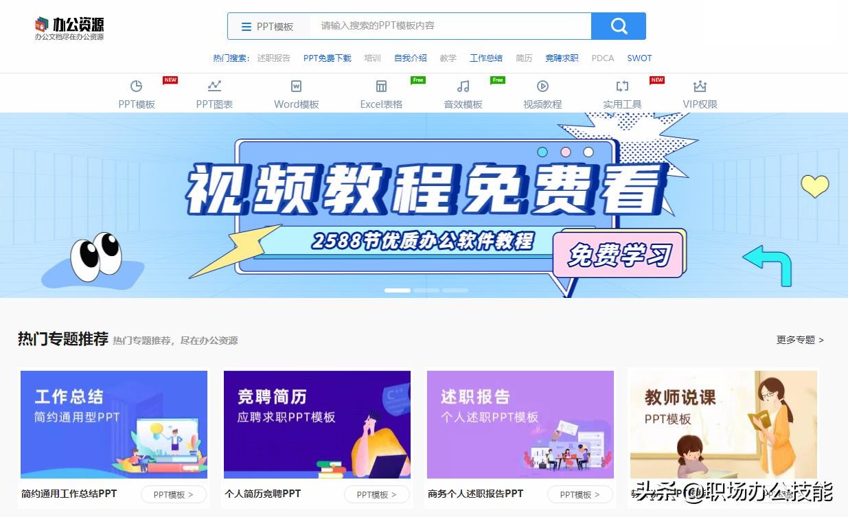 专门提供办公资源模板下载和Office教程的网站,工作总结,教育培训课件等应有尽有。在工作中如果需要制作PPT,可以直接在这里下载模板进行套用。里面的Excel表格和音效模板都可以免费使用。