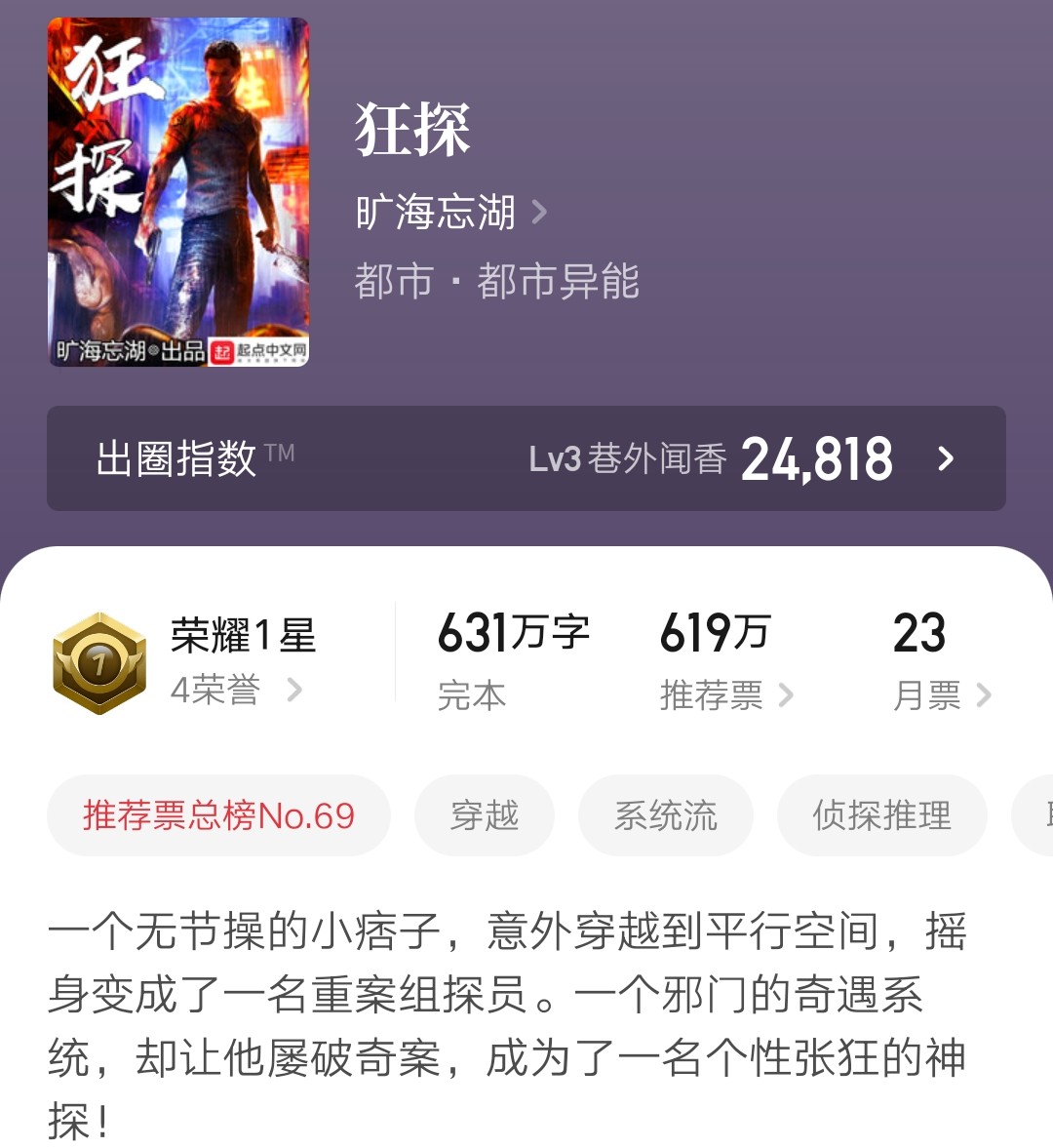 狂探这本小说是和上面几本风格完全不同类型的小说,这本小说属于金手指大开的都市爽文。小说主角本是一个流氓份子,但是却意外穿越到平行时空成为一名警察。从最开始抵触警察这个身份,到后来慢慢喜欢上警察这个职业,一直都最后为了案件的真相而努力破案,展现了主角心路变化的过程。