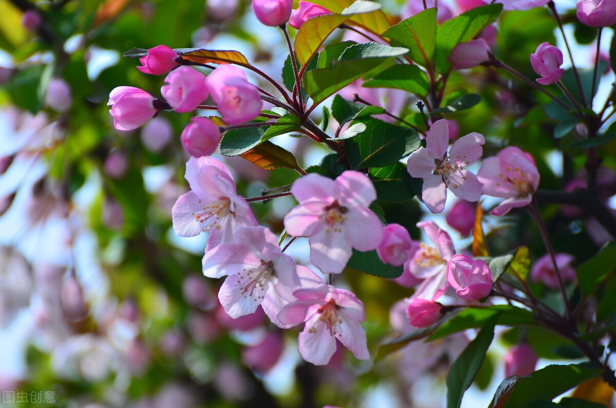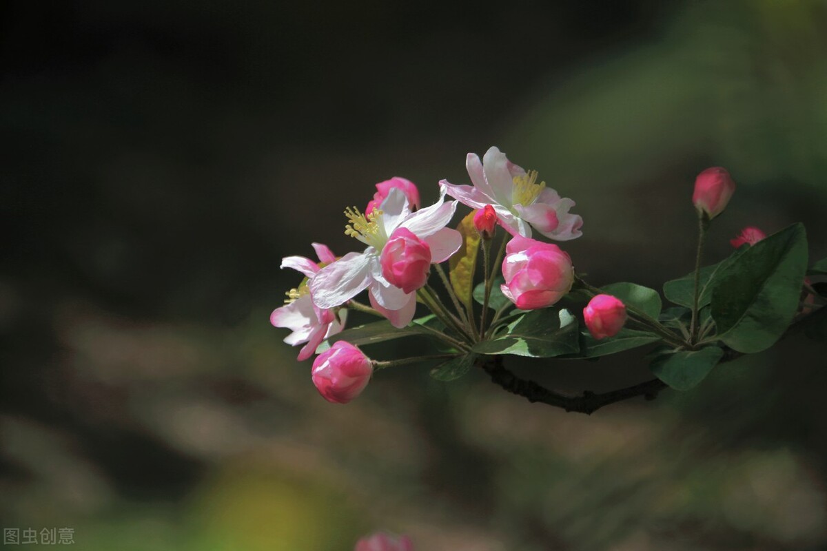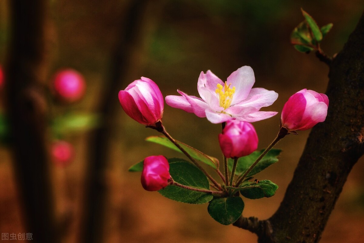 海棠花开似锦,素有“国艳”之誉。唐朝开元年间,玄宗曾夜临沉香亭,召唤醉酒的贵妃,然而杨玉环醉颜残妆,鬓乱钗横,侍者亦不能扶,明皇笑曰:这哪里是醉酒的妃子,分明是尚未睡醒的海棠。