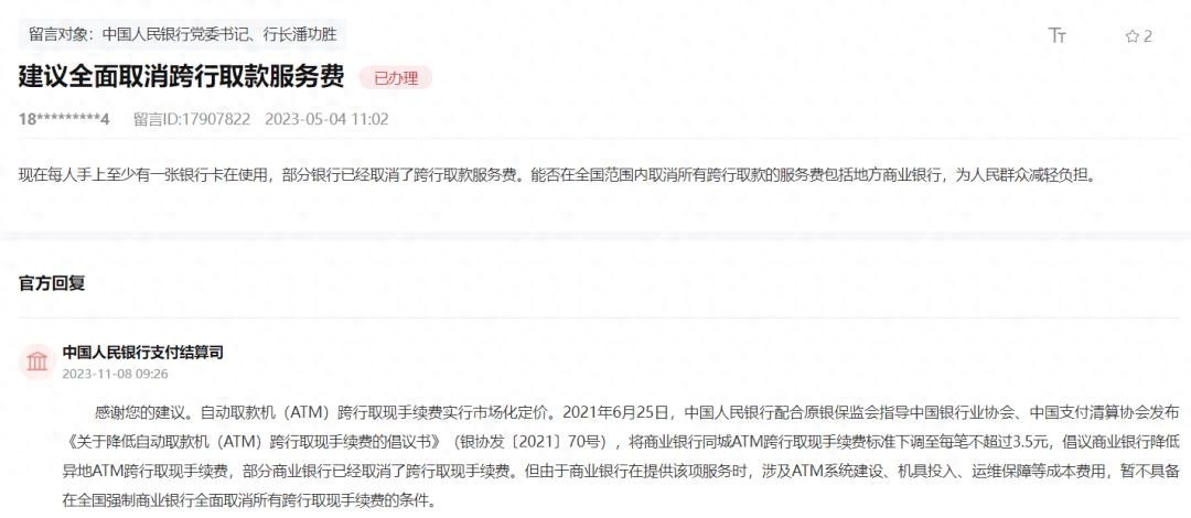 最近,有网友提出取消跨行提款手续费的建议。对此,中国人民银行支付结算司在“领导留言板”上给予了回复,表示已经有部分商业银行取消了跨行取款手续费,并将进一步推动银行降低此项费用。但是,是否应该在全国范围内取消所有银行的跨行取款手续费,这是一个需要进一步讨论和权衡的问题。