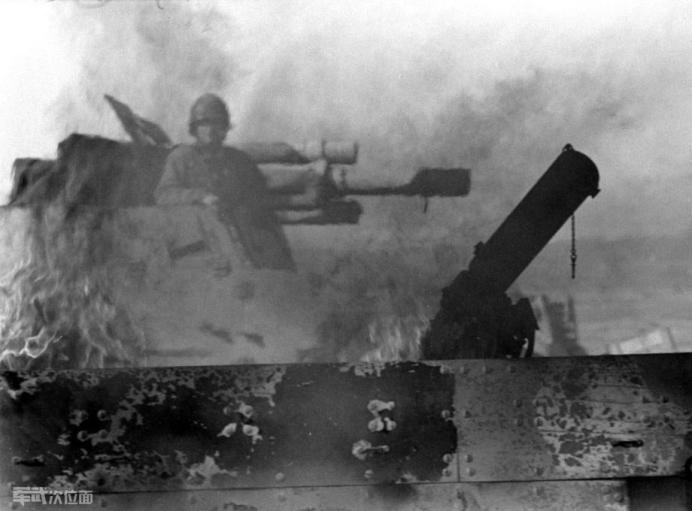 一个自行火炮小队正在严阵以待。美军的T19榴弹炮半履带车,由一门105榴弹炮安装到M3半履带车上结合而来,依据美军的说法在突尼斯的地面战中这种结合很成功。