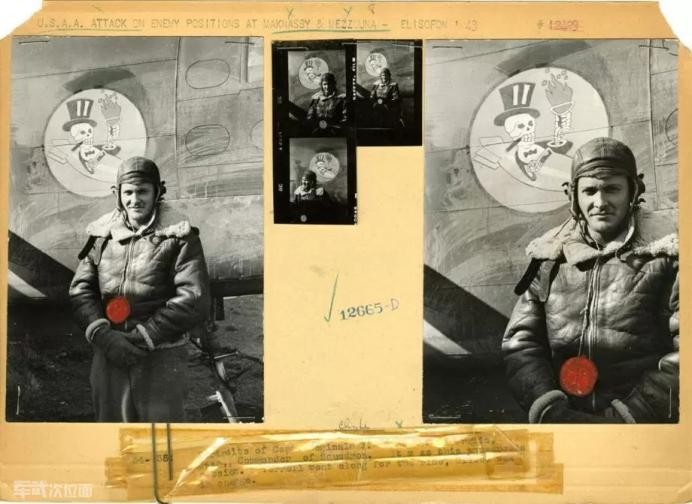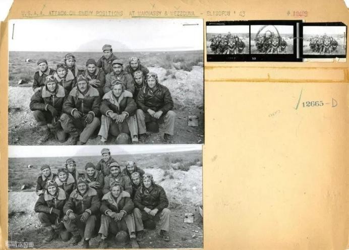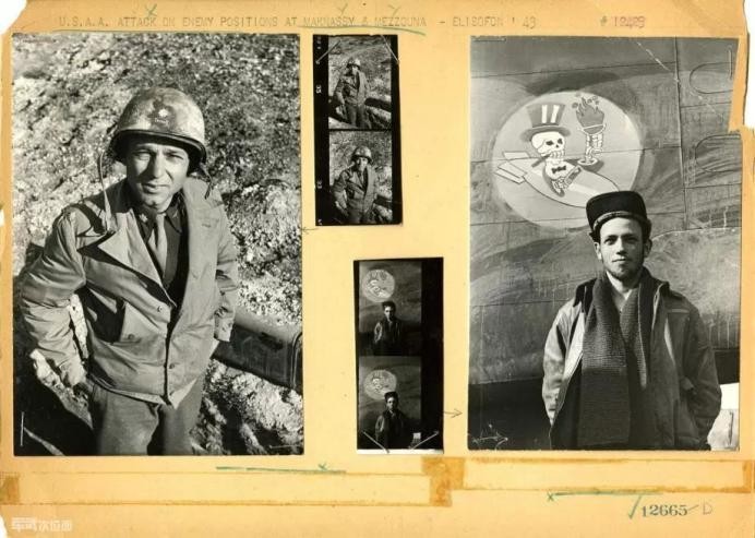 几张战时的照片和拍摄后的图片小样,罕见地粘在同一张纸上,图片来自《生活》杂志的档案,根据轰炸机上的标记来看照片里有几名士兵隶属于同一个机组 1943年