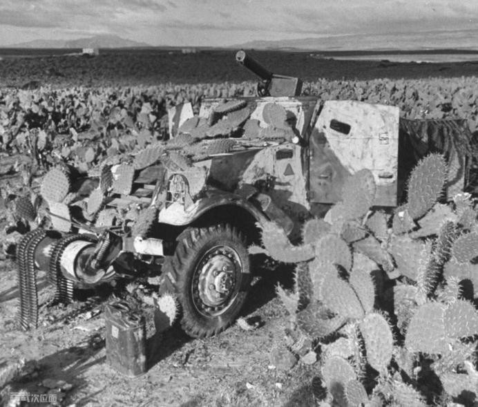 一辆守卫一个装甲师指挥部,车上覆盖着仙人掌来伪装自己的半履带车 1943年北非