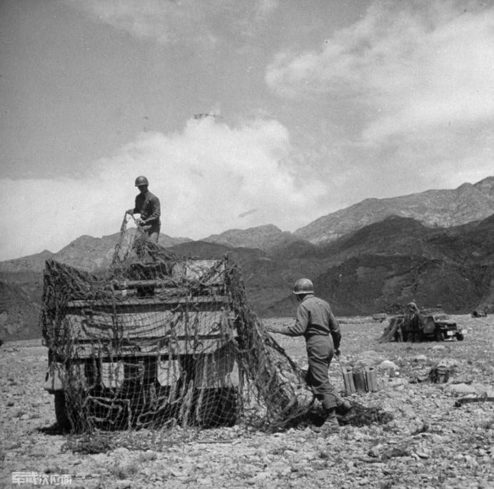 在补给点停靠并装上155mm炮弹后,士兵在给两吨半卡车用网伪装。这些补给品会趁着夜色运到炮阵地