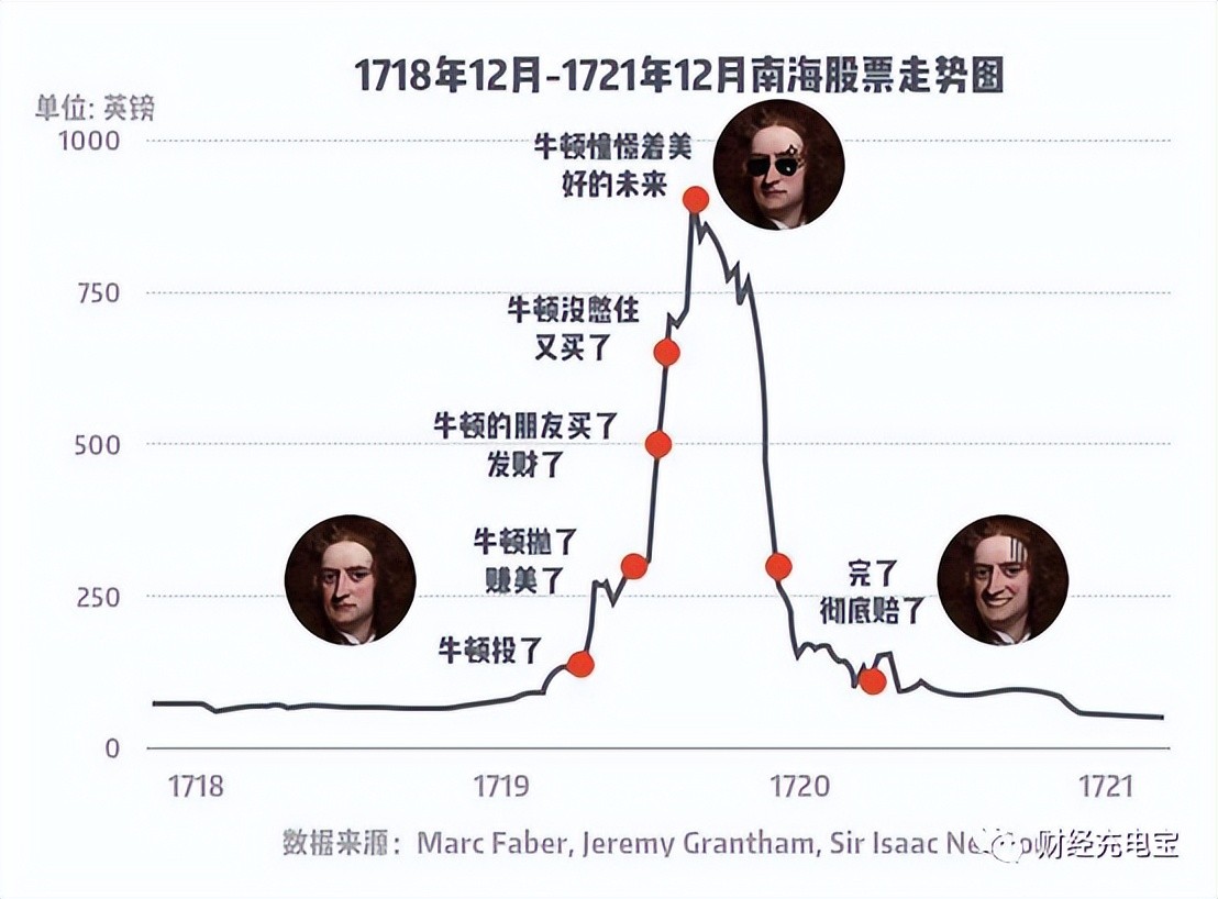 著名的物理学家牛顿爵士,也是南海泡沫事件的受害者之一,他在第一次进场买入南海股票时,曾小赚7,000英镑,但第二次买进时已是股价高峰,结果以大蚀2万镑离场。牛顿感叹道:我能算准天体的运行,却无法预测人类的疯狂!”(I can calculate the motions of heavenly bodies, but not the madnessofpeople.)