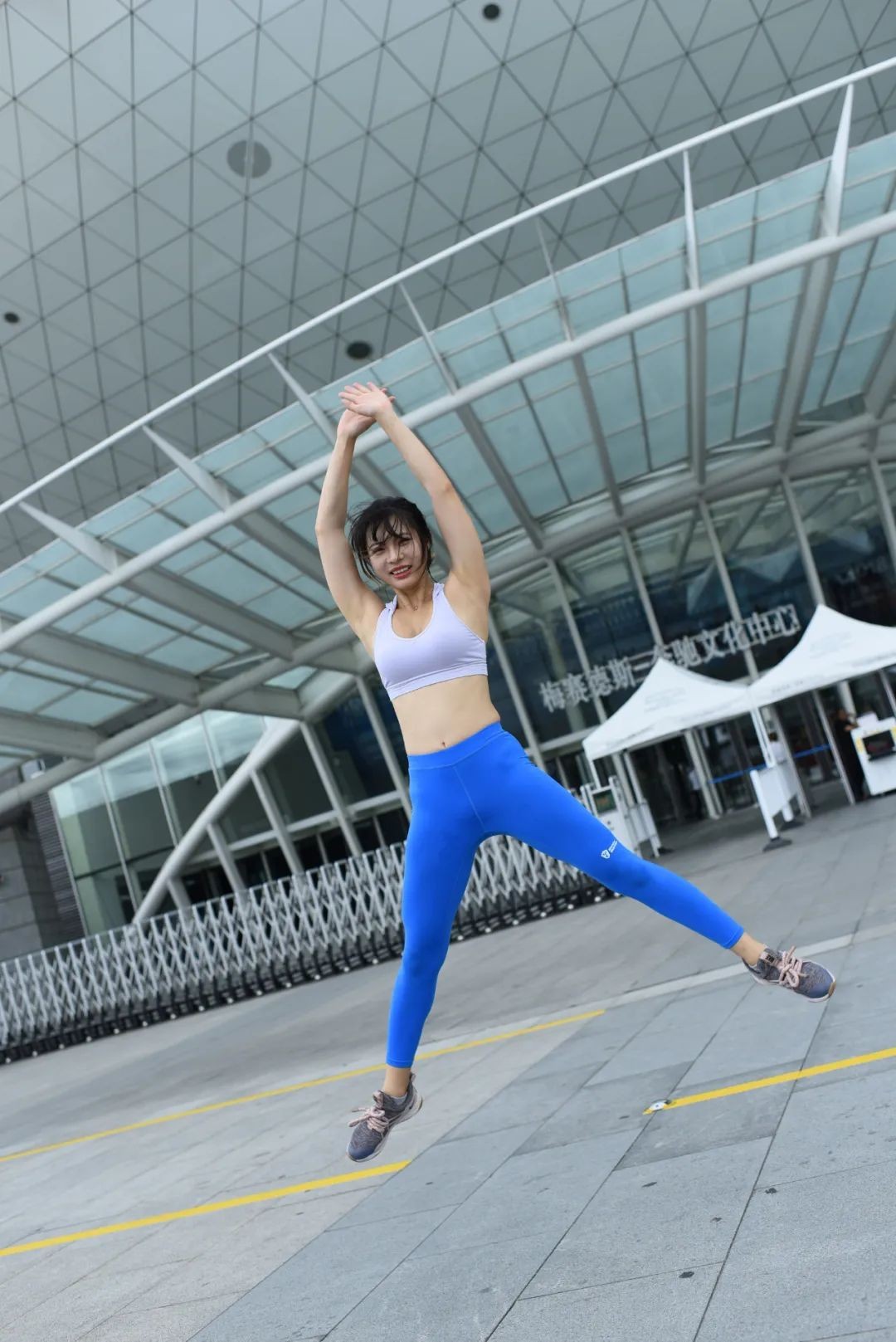 街拍:性感美背上衣搭配蓝色瑜伽裤,尽显运动潮范