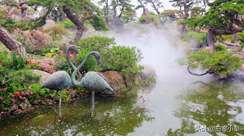 据说园林中的石头,是由30多位山东传统石艺匠人亲手一块块敲凿出来的,夏天那里五颜六色,百花齐放,人造山水景观烟雾缭绕非常好看;水中不仅有鱼,还有白天鹅特别引人喜爱,