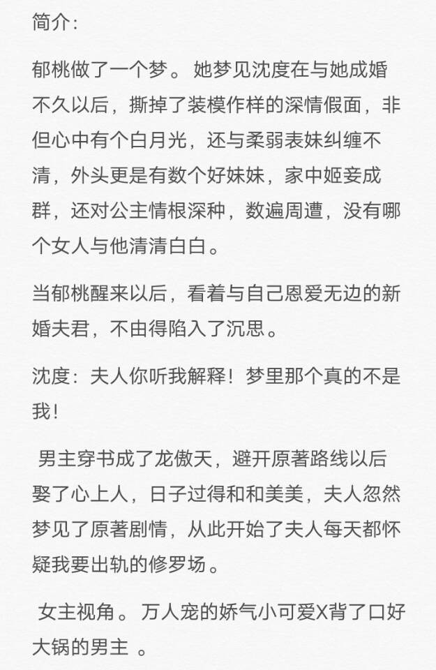 这本小说书穿的不是女主,男主穿越进一本种马文里,爱上女主并娶了女主,结果女主觉醒记忆,总怀疑男主要出轨......