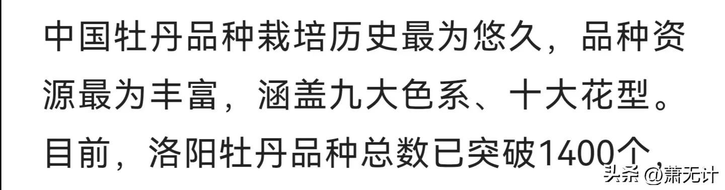 二.斥巨资在市区修建大面积的牡丹专类观赏园,如1500亩的中国国花园、2800亩的隋唐遗址植物园、5300亩的南山牡丹文化产业园和牡丹博物馆。另外除了市区,还在嵩县、栾川等修建高山牡丹园,可以让游客在4月末也能看到牡丹。截至2021年洛阳牡丹载植面积36万亩,其中观赏牡丹面积5万亩。观赏牡丹品种达1400种,是全世界牡丹品种最多的地区。
