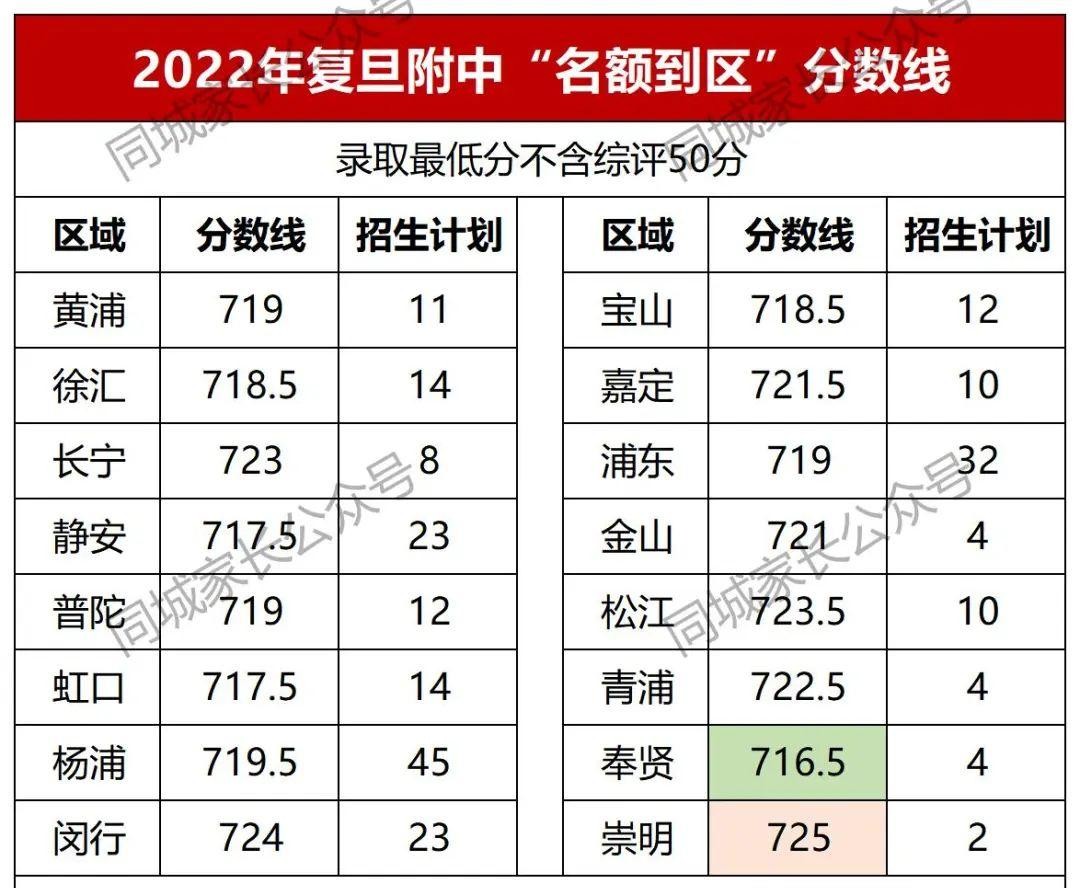 2022上海中考复旦附中“名额到区”招生计划228人,最高分崇明725分、最低分奉贤716.5分。