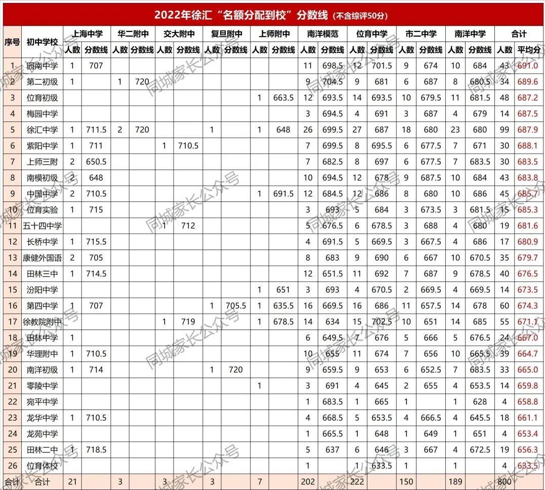 “四校”名额到区分数线:上中721分、复附718.5分、华二713.5分、交附712分“八大”名额到区分数线:七宝715分、南模715.5分、建平710.5分、格致701.5分、控江704分、大同704分、延安706分、复兴没有徐汇招生计