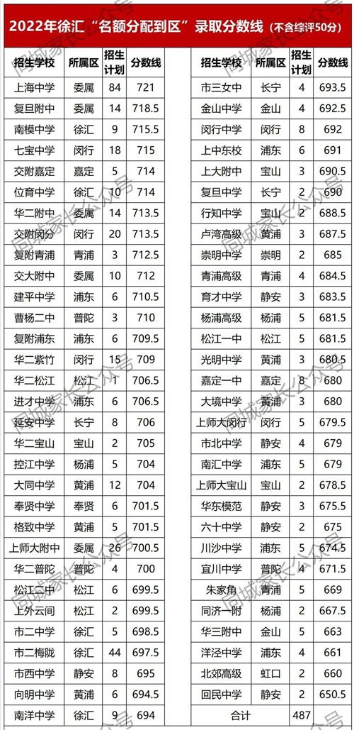 2022年,全市共有61所市重点高中,在徐汇进行“名额分配到区”批次招生,合计招生计划487人。