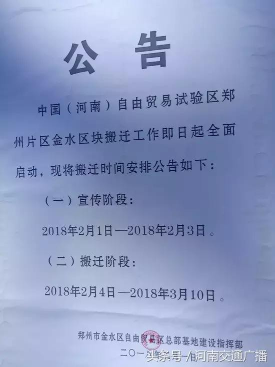 里头显示,“中国(河南)自由贸易试验区郑州片区金水区块搬迁工作即日起全面启动”,2018年2月1日-2月3日为搬迁宣传阶段,2018年2月4日-3月10日为搬迁阶段。