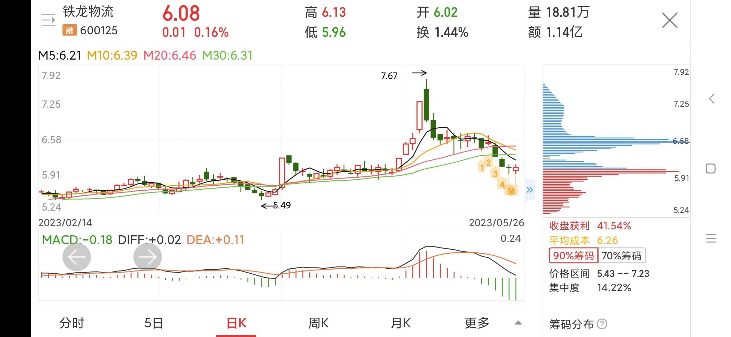 日线看,股价跌破6.6元的强支撑平台,来到6元强支撑平台上方,短线6元的支撑非常强,股价可能会在此震荡。筹码分布显示,上方套牢筹码众多,6元下方筹码还未出货,此位置的支撑也比较强。
