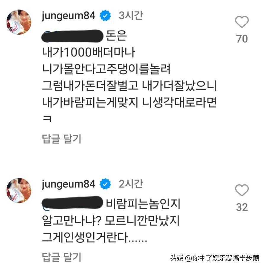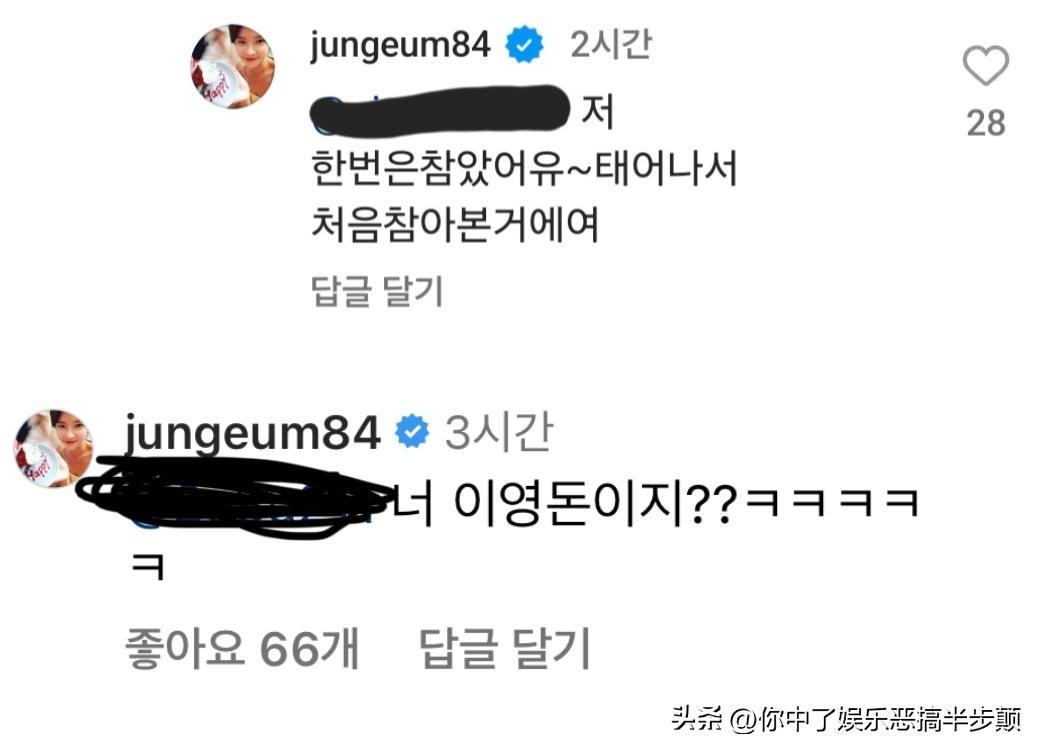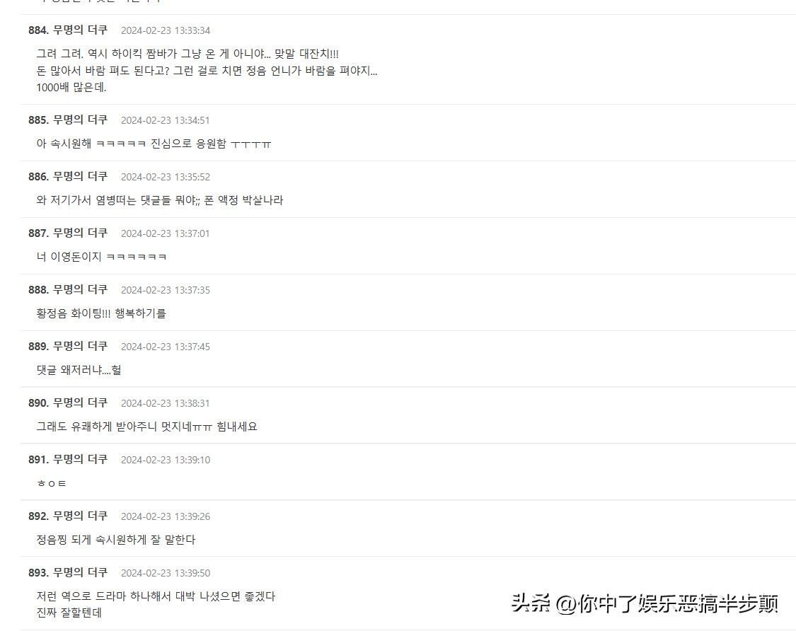 而这段精彩的留言互动一经曝光,立即引起了大量韩国的热议,纷纷留言支持黄正音“多1000倍,姐姐太酷了”、“你是李英敦绝杀,哈哈哈哈”、“希望姐姐好好度过难关,未来走向幸福的路上”、“姐姐加油”等等,甚至还有网友留言表示希望黄正音能拍一部这样角色的电视剧!