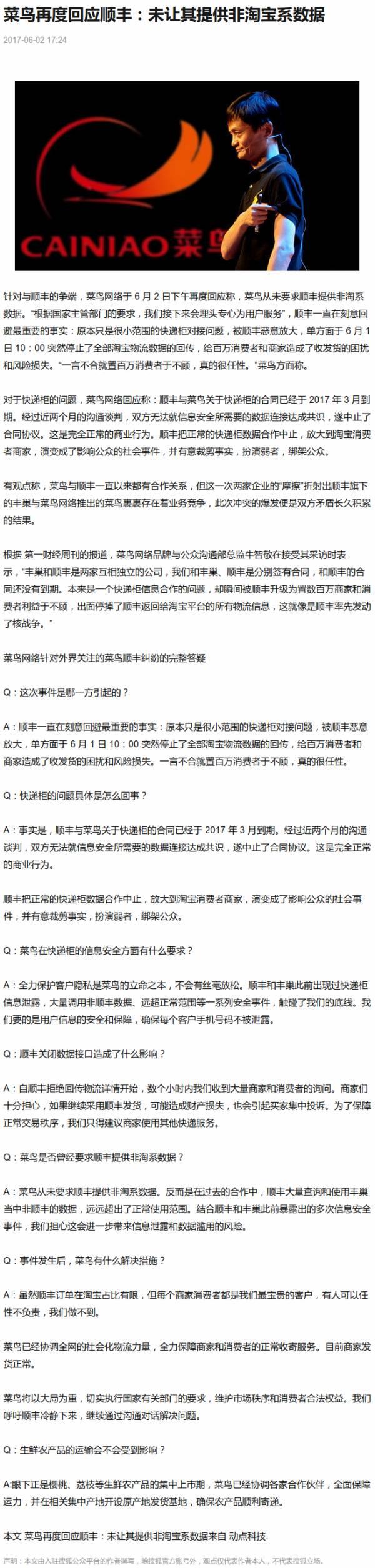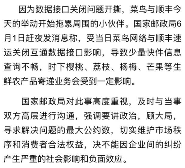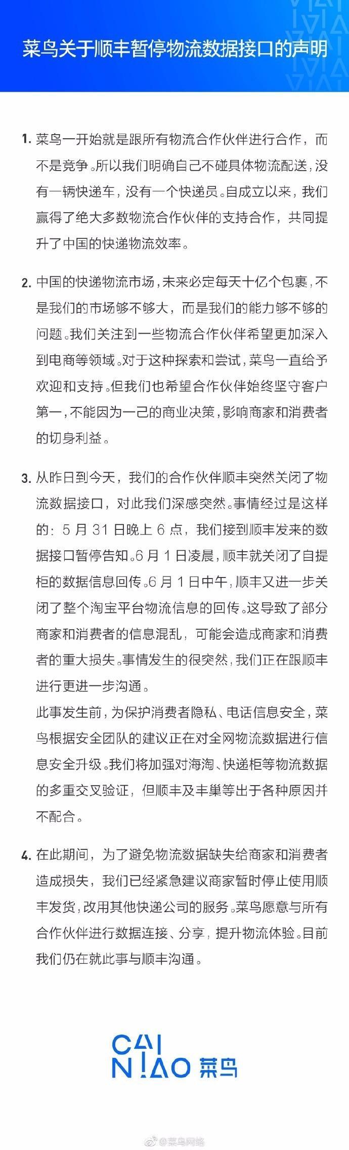 6 月 1 日下午,菜鸟网络发表《菜鸟关于顺丰暂停物流数据接口的声明》称,5 月 31 日晚上 6 点,菜鸟接到顺丰发来的数据接口暂停告知。6 月 1 日凌晨,顺丰关闭了自提柜的数据信息回传。6 月 1 日中午,顺丰又进一步关闭了整个淘宝平台物流信息的回传。