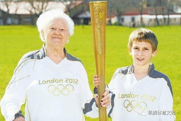 ▲2012年伦敦奥运会最年长的火炬手、在火炬接力开始时将满百岁的古尔德与年纪最小的火炬手、十一岁的麦高恩在英国伦敦共同展示火炬。