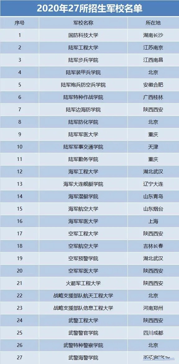 这里就是要提醒一下各位同学,在这里面的并不是所有的军校都会在每个省份招生。打一个简单的比方,假设这27所学校里面只有15所学校在湖北省招生,那么湖北省的考生就只能报考这15所已知可以招生的军校,至于其他的12所军校,湖北省的考生是没有报考资格的,就是报考了,学校的报名系统也是直接将志愿筛检排除。