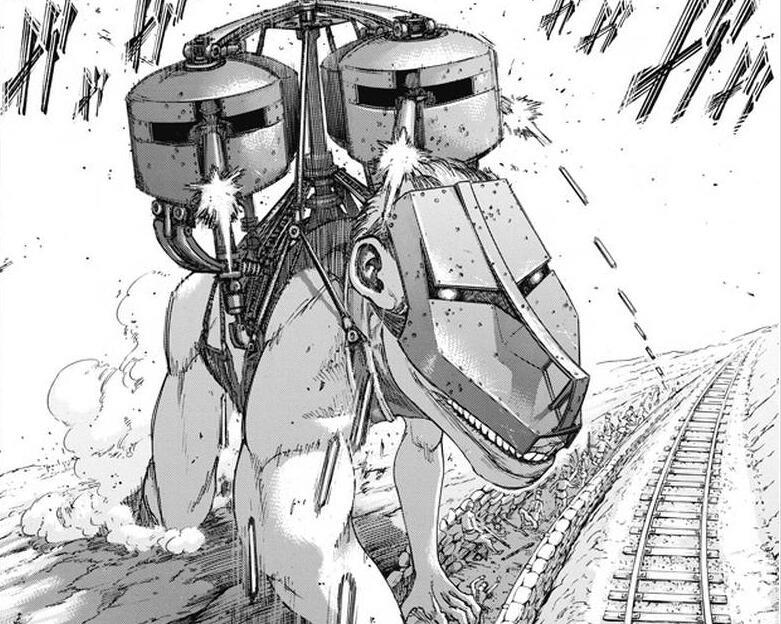 漫画81话,四足茶几巨救下兽之巨人后,以说话方式命令其余巨人去拦截利威尔。说话的权限已经让四足茶几巨凌驾于【奇行种】之上,虽有伊尔泽的OAD外传,其中遇到的奇行种同样能断断续续说话,但91话漫画里,四足茶几巨可是背上扶着两个机枪碉堡!如果说,巨人有着杀戮人类的本性,那么四足茶几巨便是克服自己吃人的本性,这已然是智慧巨人的范畴。
