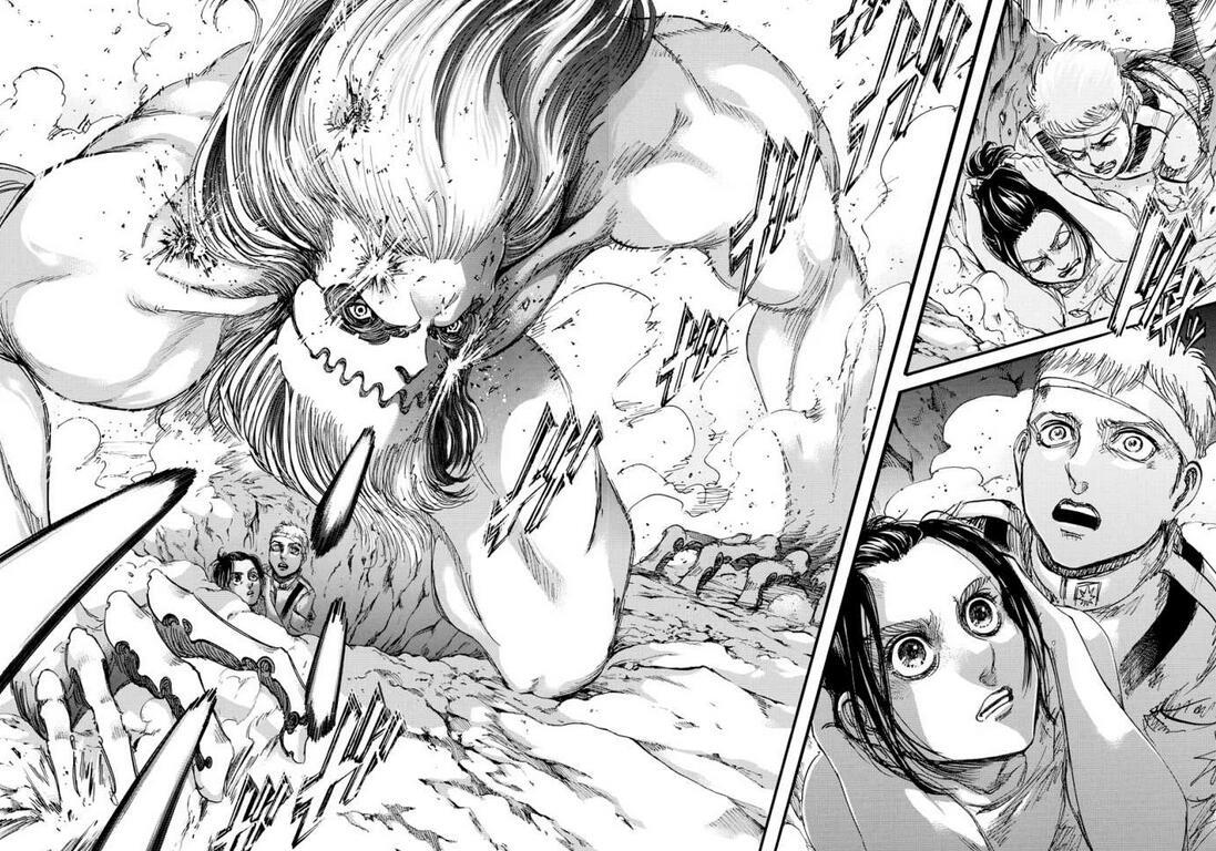 91话内,巨颚首次登场,并曝光其拥有着为加利亚特,借此能敲定巨颚应为【九大巨人】之一,身为智慧巨人并有着巨人之力。而车夫(四足茶几巨)则再度登场,从柯尔特建议马加特队长派出【巨颚】+【车夫】来看,将四足茶几巨摆放在同九大巨人平等的地位,它本身便极有可能超越【奇行种】的概念。如果说四组茶几巨是一个特殊巨人种的话,为何漫画出到这,只出现过这一只四只脚走路的巨人?