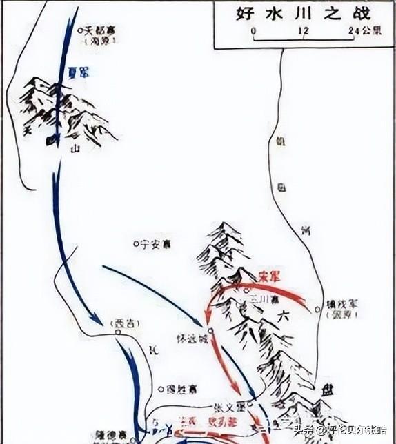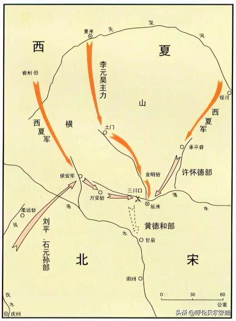 公元1044年十月,辽兴宗亲率骑兵10万,分三路渡过黄河,长驱直入400里,讨伐西夏,李元昊战败,向辽兴宗谢罪请和,并连续后撤三次,凡百余里,以示诚意,辽兴宗大喜,准其所请,可李元昊坚壁清野,拖延时日,趁十万辽军粮草断绝之际,在漫天黄沙之中,纵兵突袭,辽军大败,辽兴宗仅率数骑逃出生天。战后,李元昊在宋辽之间又玩起了小心思,他一边与辽讲和,一边向宋献俘,成功的将仇恨转嫁给了宋朝。
