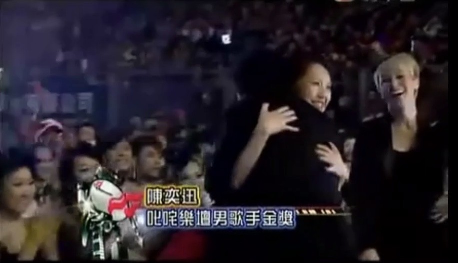 2007年,刚刚获得最受欢迎的男歌手的陈奕迅在众目睽睽下给同样获得最受欢迎奖的杨千嬅一个欢喜的拥抱。