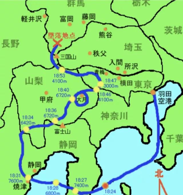 18时25分,在多野郡上空,飞机机舱内突然发生爆炸减压,高压空气冲进机尾,直接将垂直尾翼吹落,飞机液压系统几乎全部失灵。飞行员和机师与几近完全失控的飞机搏斗了半小时,最终无力回天,18时56分,飞机在高天原山撞山坠毁。
