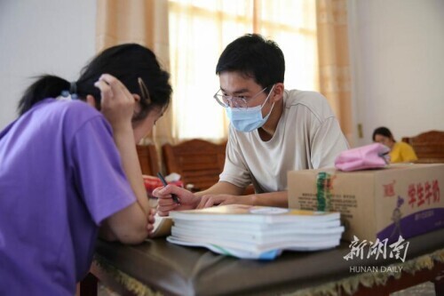 2021年9月10日,在湖南省邵阳市隆回县三阁司镇中学,陈小宝为学生释疑解惑。曾勇 罗仁洲 摄影报道