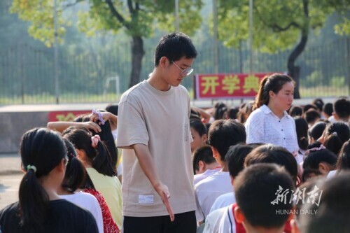 2021年9月10日,在湖南省邵阳市隆回县三阁司镇中学,陈小宝在学生集会中纠正学生队列。曾勇 罗仁洲 摄影报道