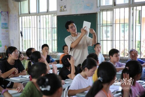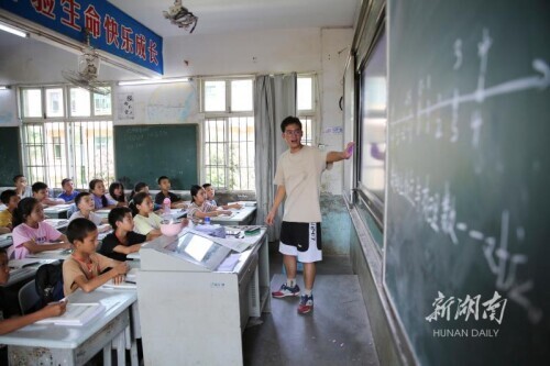 9月10日,隆回县三阁司镇中学,陈小宝在上课。2000年7月出生的陈小宝在2016年初中毕业时受到家里的熏陶,决定报考湖南省初中起点农村教师公费定向培养专项计划。经过五年的学习,今年从长沙师范学院毕业的他,通过选岗来到了隆回县三阁司镇中学。在这所农村寄宿制学校,他担任一个七年级班的班主任,任教两个班的数学,并兼任学校特殊残障学生的送教上门教学。因大多数父母在外打工,孩子们缺乏陪伴,陈小宝凭借自