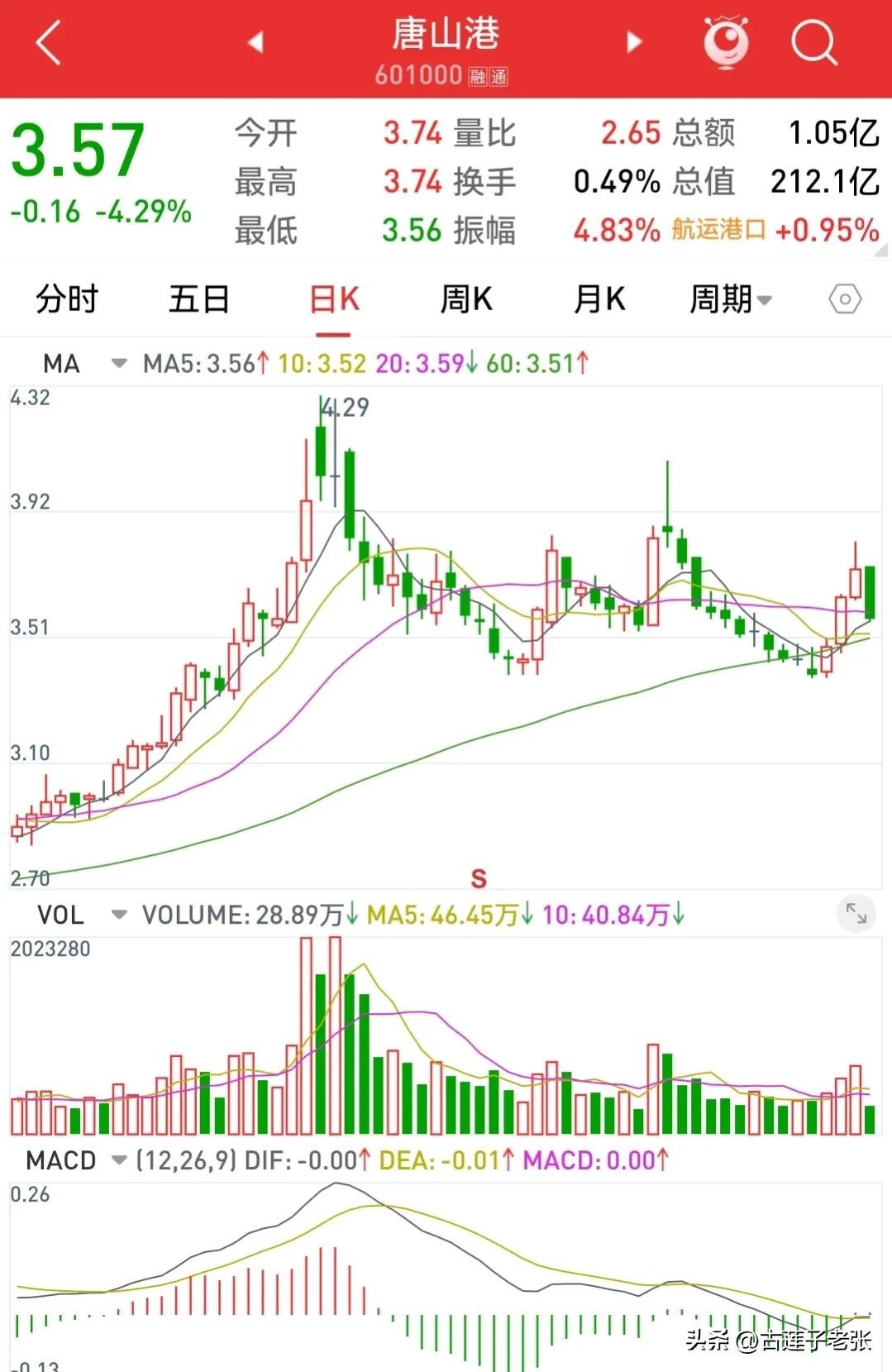 今天早上唐山港开盘即下杀。您害怕了没有啊 ?截止到上午10点26分,唐山港最低价是3.56元,跌0.17元。