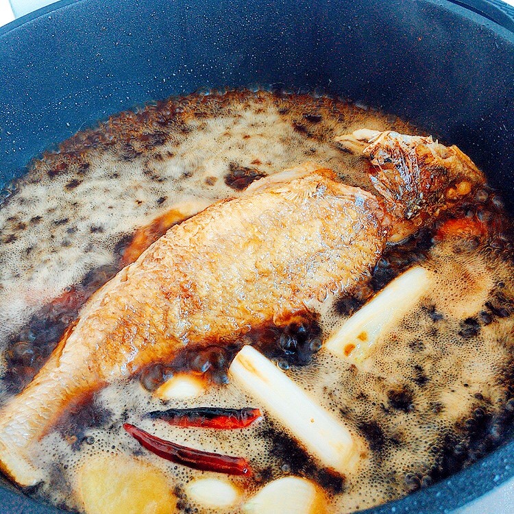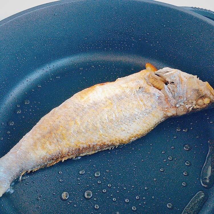 1.用煎锅把黄姑鱼煎至两面金黄。