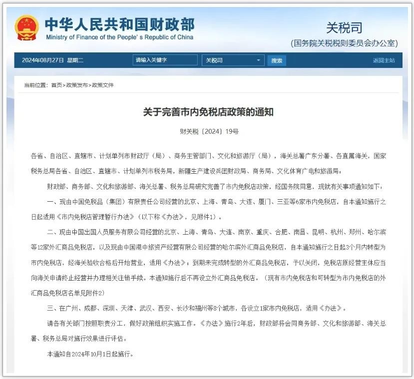 2024年8月,财政部、商务部、文化和旅游部、海关总署、税务总局印发《关于完善市内免税店政策的通知》,明确将在深圳等8个城市各设立1家市内免税店。