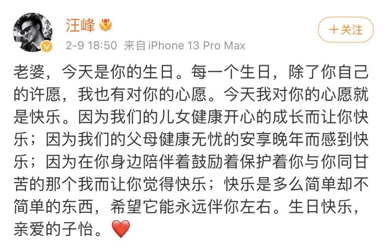 与那些敷衍的生日快乐相比,汪峰写下的祝福真挚又温暖,言语里都诉说着对妻子的感激和珍惜。