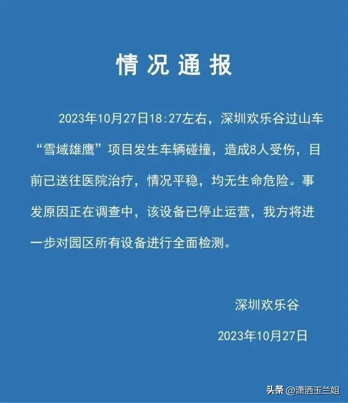 事故发生后,各项救援措施迅速展开,受伤人员被迅速送往医院抢救,确保受伤者生命安全,10月27日深夜23点27分,深圳欢乐谷发布了情况通报,通报称:事故造成8人受伤,目前设备已停止运营,事故原因正在调查之中。