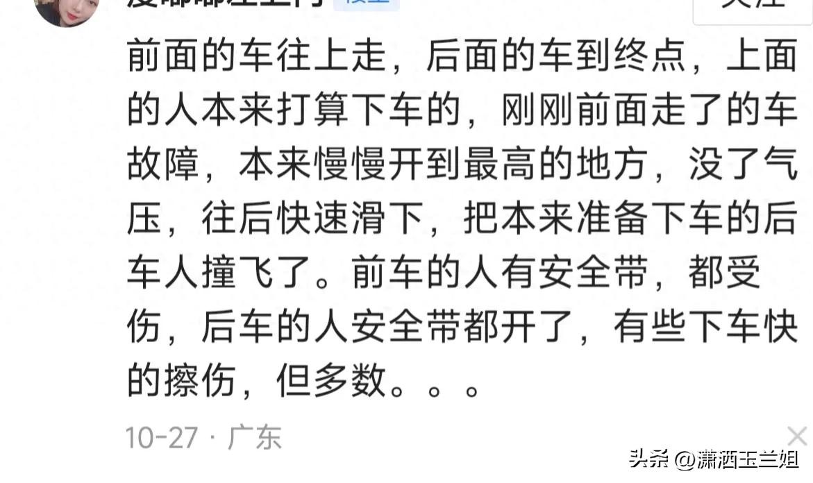 事故发生时间是10月27日18点27分左右,据亲历者消息,事故原因是前面车出了故障快速后退撞到了后面车辆,把本来准备下车的人员撞飞了