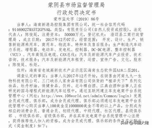 早在2019年,国马新能源公司就扬言要在10月份上市,上市后将发行6000万股,并以8元每股的价格兜售原始股。但还没等到公司上市,国马新能源隶属的新港岛集团就因“组织策划网络传销”而被市场监督局处罚。