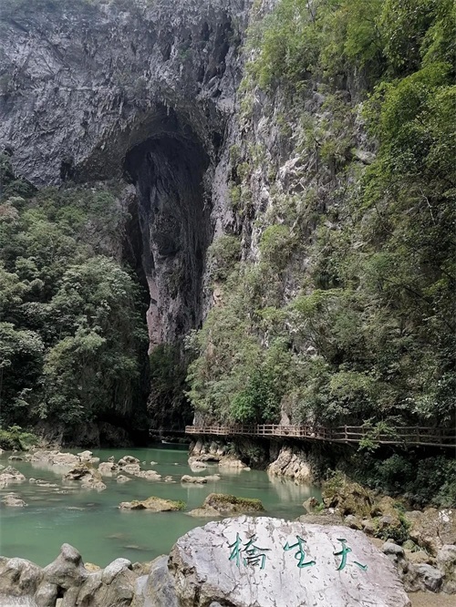 天生桥横跨河两岸的天然巨岩,是喀斯特貌奇观之一,谷称天生桥,又谓仙人桥。高60米,厚10多米,桥孔宽20多米。