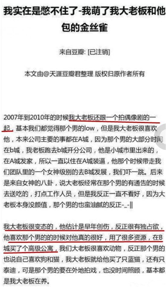 还有当年论坛上疯传的"金丝雀"文学,直接把老板和男艺人写成某种不正当关系,主角名字就差直接写陈学冬身份证号了。