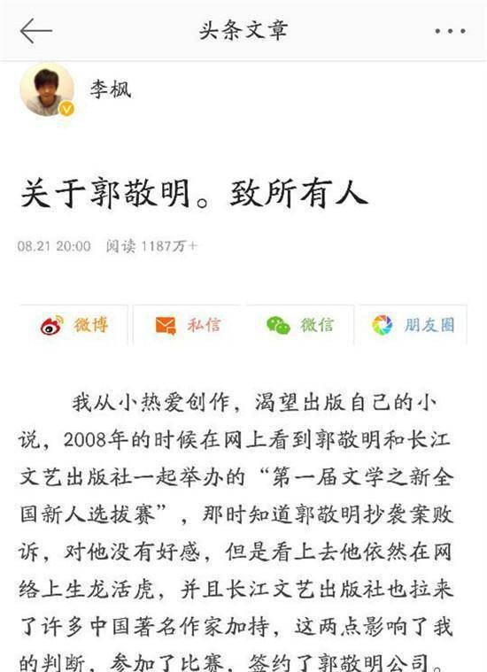 早在2017年的时候,就有个叫李枫的作家就跳出来爆料,说自己当年在郭敬明公司工作时被动手动脚,还说公司里其他男员工也遭过骚扰。